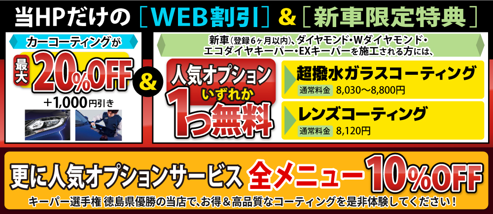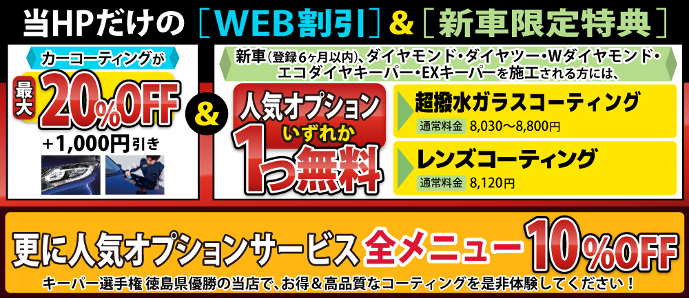 | 特徴 | ダイヤモンドキーパーのボディへの施工に加えて、さらに、ガラスコーティングを下記の「施工箇所」に施工いたします! |